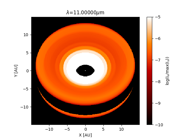 I also imaged the disk at multiple λs to see how the disk behaves. I'm using the fargo disks for these ones. All of these are heated by 4·10⁷ photons and imaged by 3·10⁵ photons. Soon I'll also provide the optical depths through the plane of the disk, which are perhaps the most important numbers for such images.